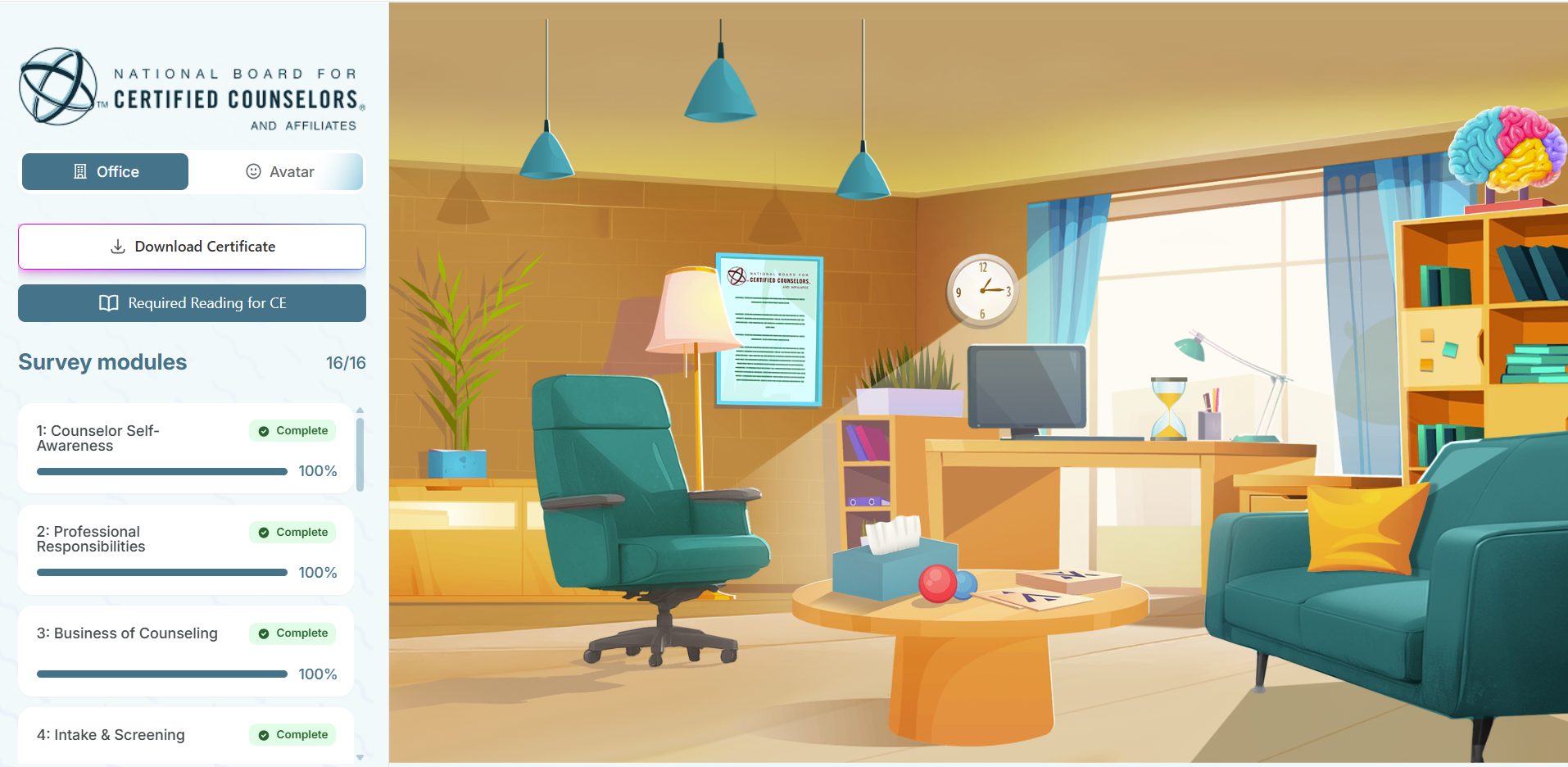 Rather than scrolling through long lists of tasks in a standard format, counselors will engage with a modern, user-friendly platform that turns survey participation into a meaningful, intuitive experience throughout which they can build their virtual counseling office. Gamification techniques make the process more enjoyable, more accessible, and more reflective of real-world decision-making. It also improves focus and completion rates, helping ensure diverse perspectives are represented.